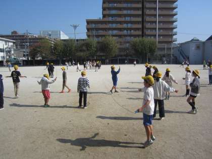 体育では、なわとびとジョギングの学習をしています。中間休みにも、縄跳びの練習をする子どもたちの姿がありました。5人でお互いの縄を持ち合う難しい技にも挑戦していました。
