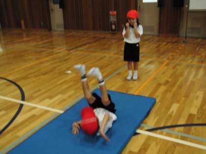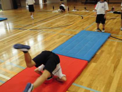 体育の学習でマット遊びをしました。ゆりかごやまえころがり、うしろころがりにも挑戦しました。