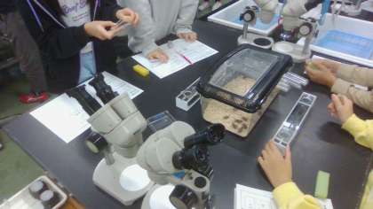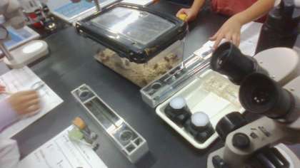 1組は生物についての学習をしました。音を目で見てみようということで、特殊な機械で音の波形を観察し、虫の体のつくりについて学びました。また鳴く虫はどうやって音を出しているのかを顕微鏡などで観察しました。摩擦音や打撃音など様々な方法で鳴く虫にみんな興味津々でした。