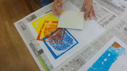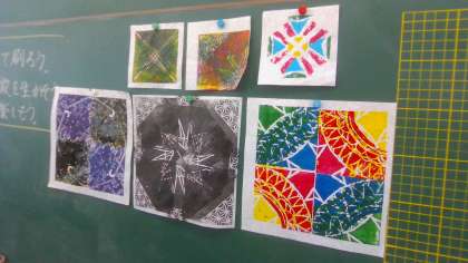 版画の繰り返し刷れる特性や色を重ねることで出せる表現、また、偶然現れた模様や様子を楽しみながら学習を進めました。一人一人の個性があふれる作品が出来上がりました。