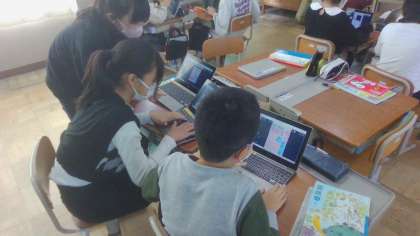 パンフレットの作成にはいりました。1組はタブレットで作りたい児童が多く、グループで協力して作っています。「この文字をもう少し小さくしよう」「分担するし、できたら僕に送ってな」といった声も聞こえ、まるで編集部のような光景です。