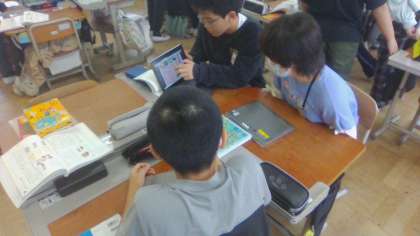 1組はグループ同士で推敲をしました。「文字が多すぎるかな。」「色のついた文字が多くて大切なところがわかりにくいな。」「ここで投げかける表現をしたらどうだろう。」「メリットや評価を入れているよ。」といった声が聞こえ、学んだことを生かしていることが伝わってきました。