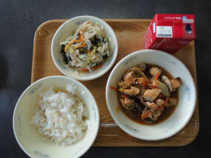今日の献立は玄米(げんまい)ごはん、牛乳、さけのちゃんちゃん焼き、小松菜と切り干し大根の煮びたしです。