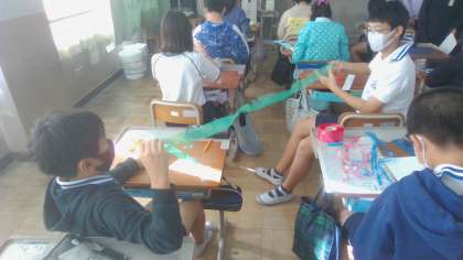 みんなで風の通り道を探しました。そしてそこに吹く風をみえるようにするためのものを作りました。スズランテープや新聞紙、画用紙を使って思い思いに風を飾り付けていました。