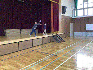 作った紙飛行機は体育館で飛ばしました。遠くに飛ばすための投げ方も工夫していました。