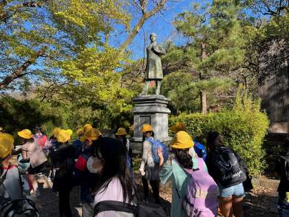殉職者の碑と田辺朔郎像を見ているところです。