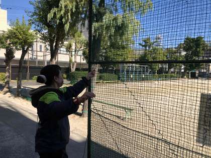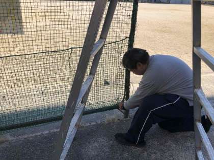 防球ネットの修繕をしています。