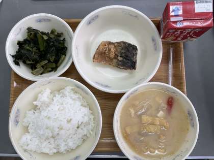 今日の献立は、ごはん、牛乳、さばのたつたあげ、ほうれん草のおかか煮、京野菜のみそ汁です。