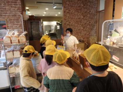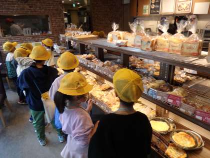 町たんけんの学習で地域にあるお店にインタビューをしに行きました。「このパン食べたことがある〜!」「買いたいな〜!」とインタビューした子たちは興味津々でお話を聞いたり、商品を見ていました。