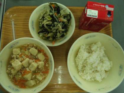 今日の献立は麦ごはん、牛乳、高野どうふのそぼろ煮、ほうれん草と切干大根のごま煮です。