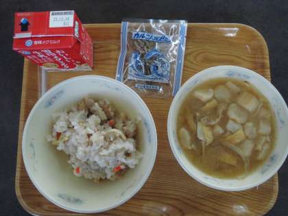 今日の献立は炊きこみ五目ごはん、牛乳、みそ汁、じゃこです。