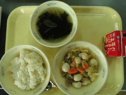 今日の献立は麦ごはん、牛乳、うずらの卵とキャベツのいため煮、わかめスープです。