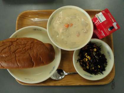 今日の献立は黒糖コッペパン、牛乳、だいこんのクリームシチュー、ひじきのソテーです。