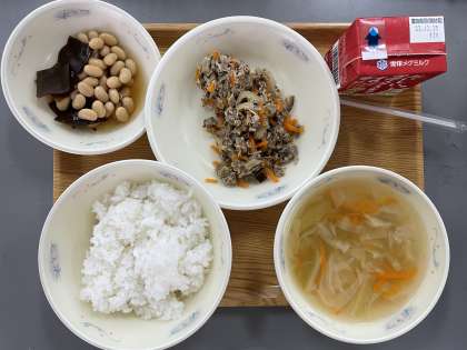 今日の献立は、ごはん、牛乳、さばそぼろ丼(具)、こんぶ豆、キャベツの吉野汁です。