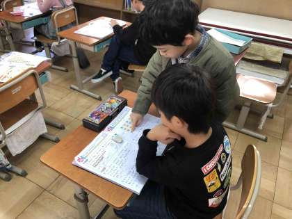 1年生が勉強を教え合っています。