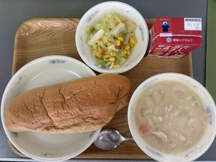 今日の献立は、黒糖コッペパン、牛乳、豆乳のクリームシチュー、野菜のソテーです。