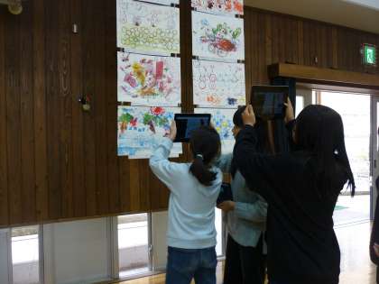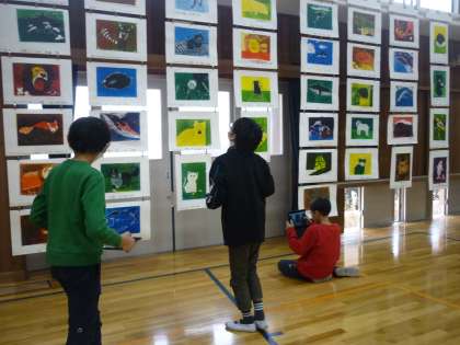 本日、作品展に出展されている作品の鑑賞をしました。他学年の作品を見て、工夫点を友達と見つけ合いながら、鑑賞していました。見つけた工夫を、自分の今後の制作に活かしていってほしいと思います。