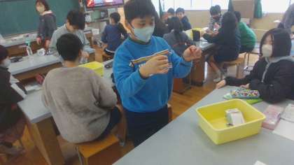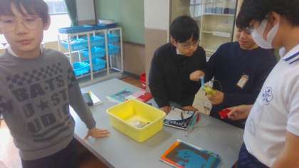 コンデンサーを使って、蓄電の実験をしました。手回し発電機が勝手に回ったり、手回し発電機の手ごたえが前回より重たかったりと、「なぜ」があふれる授業でした。