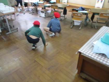 4組のメンバーは、かえる跳びをして