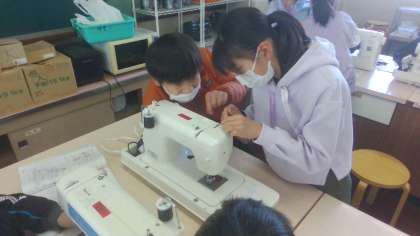 家庭科では、ミシンの学習をしています。ミシンのつくりを知り、上糸や下糸のセッティングの仕方もできるようになりました。からぬいを練習しましたが、丁寧に進めることができていました。