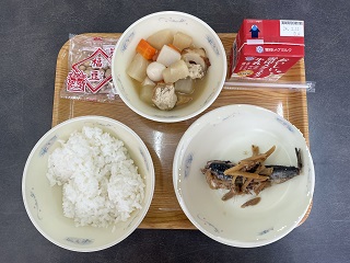 今日の献立は、ごはん、牛乳、いわしのしょうが煮、関東煮、いり豆です。