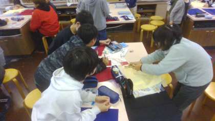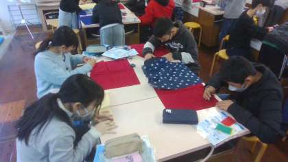 今日から早速、ランチョンマットの作成にとりかかりました。まずは、布に印をつけて、仮縫いをしていきます。2学期に習った手縫いのことを思い出しながら、奮闘しています。