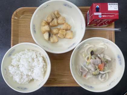 今日の献立は、減量ごはん、牛乳、たらのからあげ、豆乳鍋(うどん入り)です。今日の給食のおかずがうどんなので、ごはんはいつもより少ない「減量ごはん」となっています。