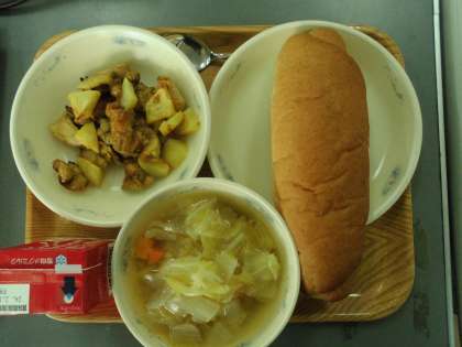 本日の給食ではスチームコンベクションオーブンで作ったそうです。カレー粉やトマトケチャップで味つけを行い、エスニックな風味に仕上がっていました。