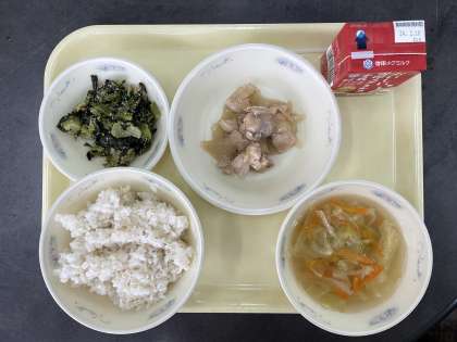 今日の献立は、麦ごはん、牛乳、鶏肉のあまから煮、小松菜のごまいため、キャベツのすまし汁です。