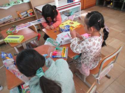 思い思いの作品ができると、さっそく膨らませていました。