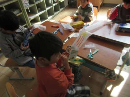 ビニル袋と空き箱を使って、袋が膨らむ仕組みを利用した作品を作りました。