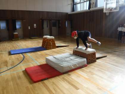 フラフープを使って、ねらいを定めた所にしっかり着地をする体ならしをしています。また、今自分の跳べる技でどんどん跳んだり、できるようになりたい跳び方を練習したり、みんな意欲的に取り組んでいます。