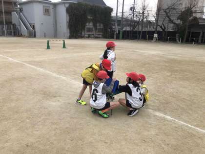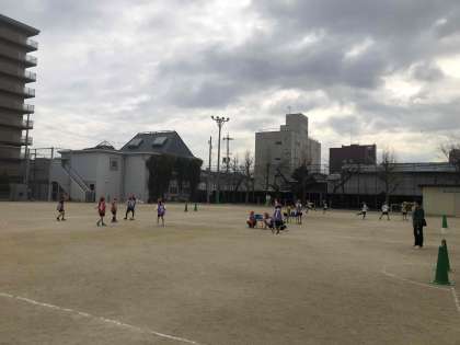 2年生が運動場でサッカーをしています。