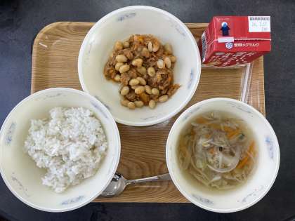 今日の献立は、麦ごはん、牛乳、大豆とツナのドライカレー(具)、キャベツのスープです。