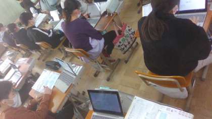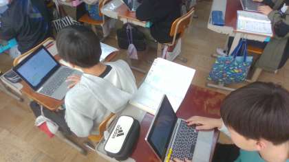 算数の時間にプログラムの学習をしました。正方形や正三角形を描きました。パソコンにそう命令を出せば思い通りに描けるか考えながら取り組めていました。