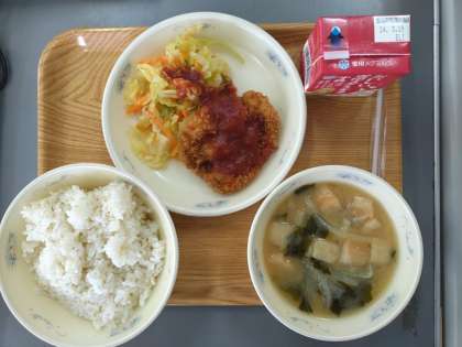 今日の献立は麦ごはん、牛乳、トンカツ、ソテー、みそ汁です。