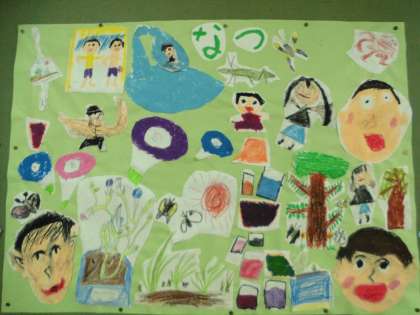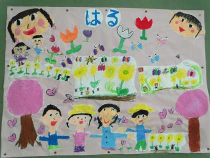 入学してくる1年生のために相談して飾りを作りました。「はる」と「なつ」の掲示物です。