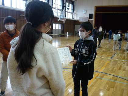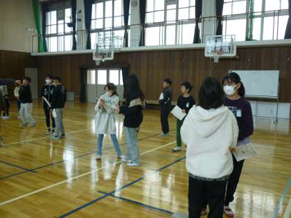 1・2組の同じ数字のグループ同士、出席番号など、様々なパターンに分け、交流しました。普段、話す機会が少ない友達とも話すきっかけになっているようでした。