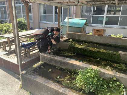 中庭の三段池では、メダカやタニシ、ヌマエビを