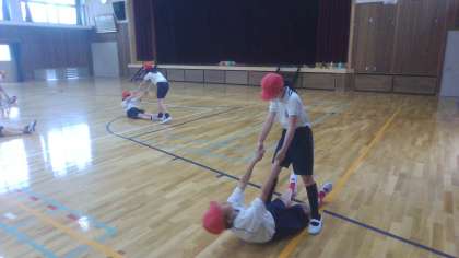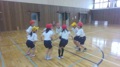 4年生1回目の体育です。二人組で体をほぐしたり、5・6人で円を作り、「ももたろう」の歌を歌いながら体をほぐしたりする運動をしました。楽しそうです。