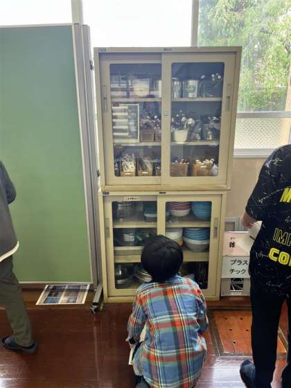 お茶入れ体験に向けて、家庭科室に何があるのか探検しました。合わせて、ガスコンロの使い方など、安全面についても学び、初めての実習に臨みます。