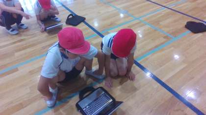 最後の体ほぐし運動です。今回は、タブレットを使って、動画を見ながら、やってみたい体ほぐし運動に挑戦してみました。ペアとグループで、「いっせーのーで」の声かけで。