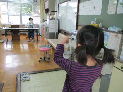 身体計測に引き続き、視力検査がありました。前の人のやり方をよく見て、輪の切れ目が見えたら指で示します。「ありがとうございました。」と言える子もいて素敵だなと思いました。