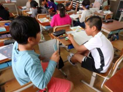 わり算と使った問題づくりに挑戦しました。「1人分を求める問題」「人数を求める問題」を作って、ペアになって問題を出し合いました。