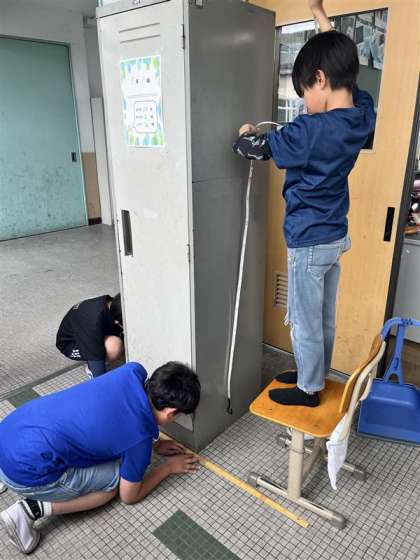 一立方メートルの体積と教室の容積について調べ、量感を養いました。「思っていたより天井は低い!」「一立方メートルが意外と大きい」など新鮮な感想を述べていました。
