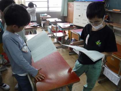 物語の続きはあるんだろうか?もしあるならどんな物語が続くのかなぁ?と、教科書にはない物語の続きをそれぞれ想像し作りあげました。今日はその交流会です。友だちの作品のおもしろい所や素敵な所を見つけることができました。