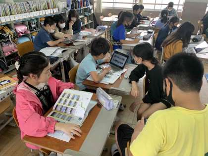 5年生はタブレットを使って意見交換。