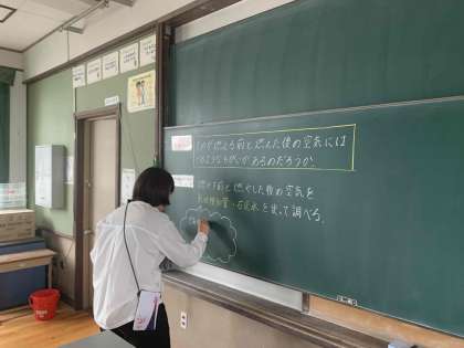 理科室では、黒板に今日の授業の板書を書いて