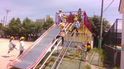 「思ったより、スピードが出るけど、おもしろい!」「いい眺め。よく見える!」と、すべり台をしたり、上から景色を眺めたりして楽しんでいました。