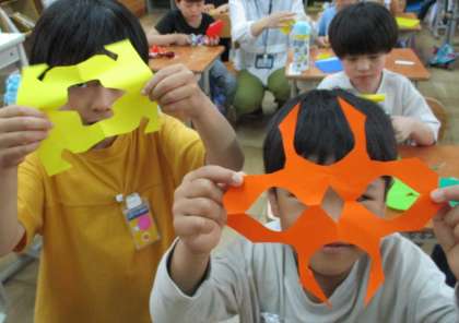 折り紙を折って、はさみで一部分を切り取って、折り紙を広げると、すてきな飾りができました。みんな嬉しそうに見せてくれて、楽しい時間となりました。